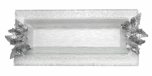 This gorgeous oblong tray by arthur court features a textured, clear glass body with metal butterfly design handles at each end, creating a beautiful contrast with the polished aluminum alloy that arthur court is known for. for stunning presentation of main entres, appetizers, and desserts, this arthur court serving tray combines form and function with total elegance in mind. designed to coordinate with additional butterfly pieces in the collection, this tray measures a generous 16.5 inches long and is suitable for the table or the buffet.