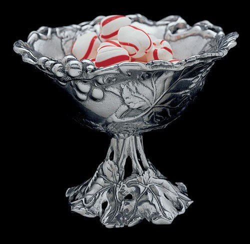 Created with plump clusters of grapes, this elegant candy dish offers a footed base. Measurements are approximately 5 inches in height and 6 inches in diameter. The dish is rendered from hand-poured and polished aluminum. Presented in an attractive gift box by Arthur Court.