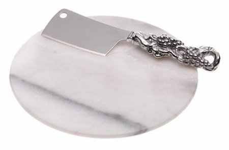 Whether starting or ending the evening with a cheese course, Arthur Court's distinctive design adds style and elegance to the presentation of any goat, cow, or sheep variety. The round, marble platter sits level on three legs and measures 7 inches in diameter--just enough to comfortably hold a big chunk of cheddar or a three small-portioned varieties. The accompanying knife offers a compact, cleaver-shaped blade with a double bevel and plenty of surface space for transporting with ease. Its handle uses the designer's signature aluminum alloy and features a molded cluster of grapes, vines, and leaves. Ideal as a housewarming or shower gift, this piece can be used with other coordinating pieces to create a cohesive look. Hand washing the knife is recommended to preserve the handle's shiny surface and the blade's sharp edge. -- Amy Arnold