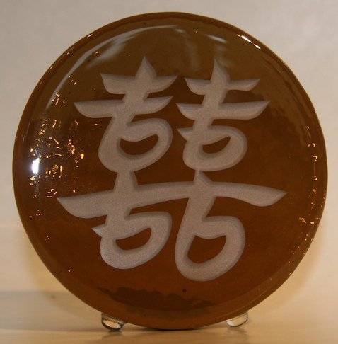 The Detailed Description of "Double Joy; Double Happiness" - 5" dia. Bronze colored traditional Art Glass Blessing for everyday or special occassions.Features