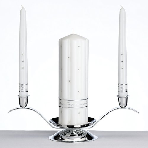 This wedding candle set includes two taper candles (9.25" tall) and one pillar candle (8.5" tall). The pillar candle is decorated with a scattering of rhinestones. Near the bottom is a silver verse band which reads "And the Two shall become as One." The tapers have three rhinestones and a silver band that reads "Two as One."