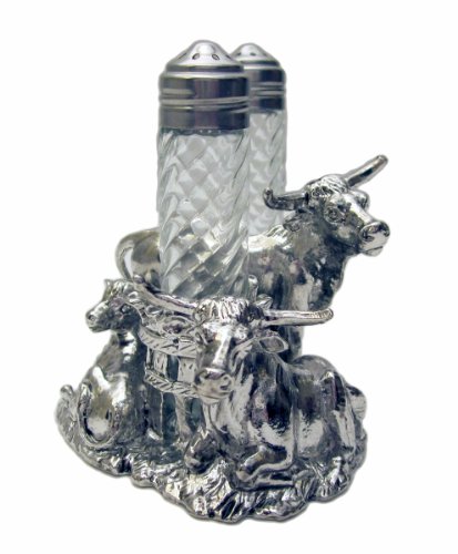 This Arthur Court longhorn salt-and-pepper set is designed to mix and match with a variety of Arthur Court western theme pieces, but can easily stand on its own. Each shaker has a cylindrical shape of swirled glass and stands about 3 inches tall with a slim 1/2-inch diameter. The screw-on lids are made of stainless steel to avoid staining or pitting from the salt. The shakers rest on a hand-crafted stand, which features detailed longhorn cattle just hanging out. The brilliant luster of the stand captures the elegance of antique silver, but is actually made of hand-polished aluminum, making it easy to maintain. This salt and pepper set is packed in an attractive gift box.