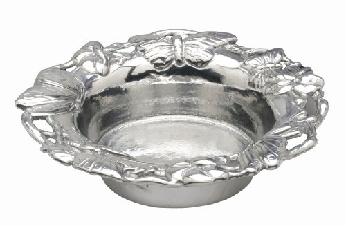 This Arthur Court wine caddy turns casual entertaining into an elegant affair. Crafted with Arthur Court's premium signature aluminum alloy, this wine holder reflects solid craftsmanship and detail, with a unique style. Ideally suited for serving wines at the table, this deep, saucer-like caddy measures 6-1/2-inch across and keeps tabletops and linens protected. This item can also function easily as a nut or candy dish. An elegant textured motif with butterflies surrounds the perimeter giving way to a smooth, shiny surface towards its center. This wine serving caddy holds a standard size bottle of wine and should be hand washed to preserve the metal's shiny surface.