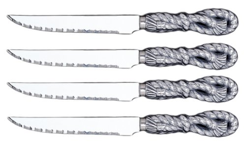 These Arthur Court steak knives feature handsome western rope design handles in Arthur Court's signature aluminum alloy, while the blades are serrated, perfect for diving into thick juicy steaks hot off the BBQ. Mix and match with additional western theme pieces in the Arthur Court collection. These knives measure 9 inches long and come packed as a set of 4 in an attractive gift box.
