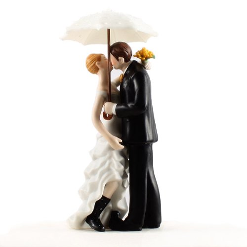 A beautiful dress, a stylish suit, one white umbrella and a great pair of rubber boots all combine to create this very adorable cake topper. Some believe that rain on a wedding day will bring good luck. Regardless, rain or shine, this delightful cake decoration is sure to stand out for all the right reasons. Hand painted porcelain. The couple is 16 cm Tall Presently the Bride and Groom Cake Toppers are available with skin tones and hair colors only as shown.