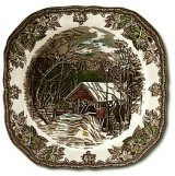 Friendly Village by Johnson Brothers, introduced back in 1952 depicts engravings which reflect English craftsmanship. This unique and traditional look recreates a "friendly village" at home that warms your table or hutch with country charm all year round. Each piece depicts a different part of this warm and welcome place. Some of the scenes included in the collection are Autumn Mists, Covered Bridge, Hay Field, Lily Pond, School House, Sugar Maples, and Village Green. The square salad plate measures 7.75"