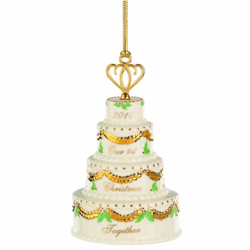 Lenox 2010 Our First Christmas Together Ornament. Each tier of this wedding cake is inscribed with words that complete the sentiment "2010 Our 1st Christmas Together." Topping the cake is a couple of intertwined hearts.