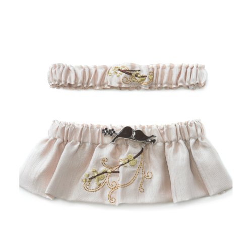 This charming Garter Set includes one keepsake garter and one to toss, and is inspired by the romantic nature of Love Birds. Two affectionate Love Birds and floral detailing adorn the keepsake garter and includes a charming brooch that can removed and worn as a lovely reminder of your wedding day. MaterialsFabric/ 100 -percent Polyester.