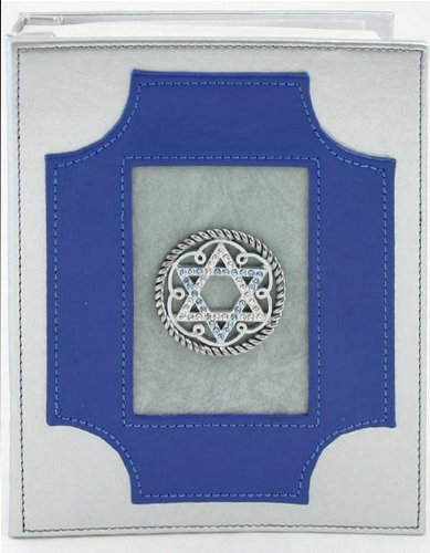 Judaica Leather Bound Jewish Star of David Swarovski Crystal Photo Album designed by Belinda Miley. This beautiful acid free Jewish photo album holds 80 4x6 photos and features a Swarovski bejeweled Star of David on the front. It is silver and blue leather bound. It will hold 80 4x6 photos. It measures Measures 8x6.5x1.5 Inches.