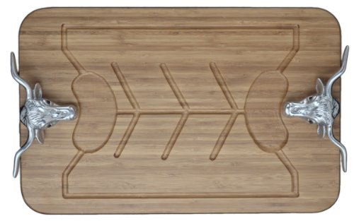 This Arthur Court carving board features a natural bamboo body with juice wells, and longhorn heads on each end that serve as handles. Great for both carving and serving meats at BBQs and festive dinner parties, this board measures a generous 20-inch in length and is 13-inch wide. The longhorn head handles are manufactured with Arthur Court's signature premium aluminum alloy. Comes packed in an attractive gift box.