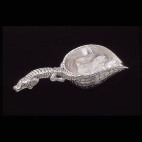 The alligator motif of this practical ice scoop is signature of Arthur Court Designs. Measuring 8 inches in length, the ice scoop is created in sand-cast aluminum. Functional and decorative, it makes serving drinks easy for the fastidious host or hostess. Please wash by hand to protect the aluminum from the high heat of dishwashers.