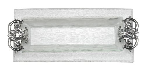 This gorgeous oblong tray by arthur court features a textured, clear glass body with metal fleur-de-lis design handles at each end, creating a beautiful contrast with the polished aluminum alloy that arthur court is known for. for stunning presentation of main entres, appetizers, and desserts, this arthur court serving tray combines form and function with total elegance in mind. designed to coordinate with additional fleur-de-lis pieces in the collection, this tray measures a generous 16.5 inches long and is suitable for the table or the buffet.
