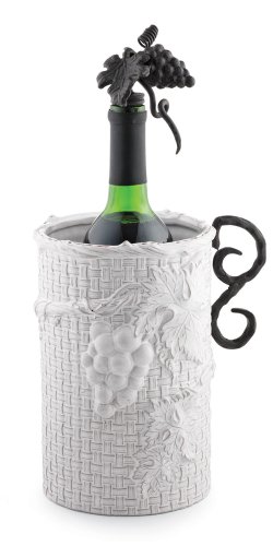 Chill out with this intricate wine cooler set! The cooler has a basket weaved look and wrapped in grapevine, all made out of terracotta and painted white. The metal handle creates a sophisticated look. Included is a wine bottle topper sculpted to look like a bunch of grapes and a decorative leaf, the topper is also made of metal and has cork attached to keep wine fresh. Put this cooler in the fridge and take out when entertaining at your home to impress all your guests with your beautiful and functional wine cooler! And when the party is over, cork the wine for a later time with the bottle topper. This cooler is 8 inches tall and 5.5" diameter.