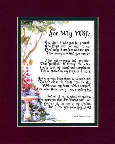This beautiful, heart-stirring verse is sure to touch your wife's heart in a profound and meaningful way. It was created by nationally recognized poet, Genie Graveline. Genie's work can be found in fine gifts shops throughout the country. This quality product is 8x10 in size. It is double-Matted. The Verse is ........... For My Wife......Too often I take you for granted,......And forget what you mean to me........How lucky I am just to have you,......How loving and kind you can be.......I fail just to pause and remember,......That "faithfully" all through the years,...... You've been my friend and companion,......You've shared in my laughter & tears.......You've always been there to console me,......To help chase the clouds from the sky.......Whenever my heart needed comfort,......You were there, every time, standing by.......And all of my happiest memories,......Are moments that I've shared with you.......You're truly the love of my lifetime,......And I love you so deeply...I do!