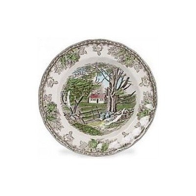 Friendly Village by Johnson Brothers, introduced back in 1952 depicts engravings which reflect English craftsmanship. This unique and traditional look recreates a "friendly village" at home that warms your table or hutch with country charm all year round. Each piece depicts a different part of this warm and welcome place. Some of the scenes included in the collection are Autumn Mists, Covered Bridge, Hay Field, Lily Pond, School House, Sugar Maples, and Village Green. The rim soup/pasta plate measures 8.5"