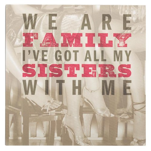 This box sign features the famous lyrics, " We are family I've got all my sisters with me". This wall art is printed on a wooden sign with a graphic background, that has a canvas appeal. The sign is 12" x 12" x 1.5" and can be hung on a wall or stand against a wall on a flat surface. Great for that song you share with a special someone or a music junkie!