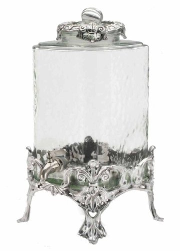 Perfect for parties, buffets or special events, this beautiful Arthur Court fleur-de-lis beverage server features a generous 2-1/2 gallon removable beverage vessel in clear, textured glass on a footed metal stand in an attractive fleur-de-lis motif. The lid also features a matching motif in the same design, all done in Arthur Court's signature premium aluminum alloy. A feature that sets this beverage server apart is the built-in spigot that is manufactured of high quality stainless steel and is made to last. Fill this gem with juice, iced tea, water, punch or margaritas, and you have a party at the ready where your guests may serve themselves. Measures 19-inch high by 10-inch in diameter and comes packed in an attractive gift box.