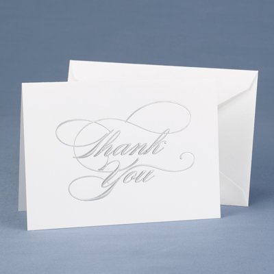 - Package of 50 white thank you cards with the words thank you embossed in silver foil; 50 envelopes included