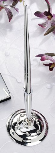This silver-plated pen set includes a silver pen (with black ink) and silver pen holder. The holder is decorated on top with a string of engraved butterflies and rhinestones. This pen set measures 9.25" tall and is a perfect match for the GB710 guest book.