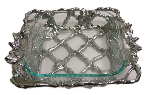 Great for entertaining, this Arthur Court Butterfly Casserole ensemble features a sturdy footed stand in a beautiful butterfly/garden motif made of Arthur Court's signature aluminum alloy. The removable square glass Pyrex baking dish allows you to bring a bubbling casserole straight from the oven, place it in the stand and serve at the table. The Pyrex casserole is dishwasher safe, and has a 2-quart capacity.