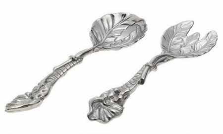 Arthur Court Designs produces an abundance of decorative aluminum tableware in compelling and often whimsical motifs. Many feature intricately detailed animals, such as these two salad servers from the Elephant collection. Hand-crafted from a brightly polished, food-safe aluminum alloy, each of the 11-inch-long servers is sculpted into the profile of an elephant's head whose trunk is holding a bunch of leaves, one shaped like a spoon, the other a fork. The set strikingly complements the Elephant salad bowl or any wooden salad bowl for an African tableware motif.