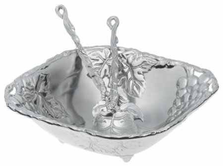 This Arthur Court 3-piece salad set is perfect for serving salad for two, or for a side dish. The bowl, with its medium capacity and square silhouette, has a mirror-like finish in the center, and beautifully detailed grapevine fretwork which graces the edges, making it a stunning piece. The salad serving set pieces are more petite than our other salad sets, and the scoops have an attractive grapeleaf design. The decorative metal is manufactured using Arthur Court's signature premium aluminum alloy.