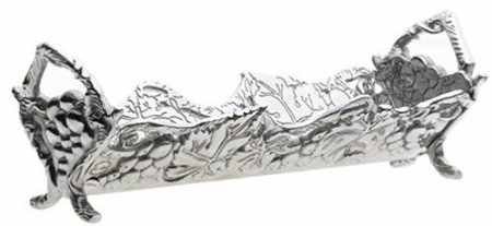 Although an regular accompaniment to serving cheese or a bowl of steaming soup, crackers rarely get a customized serving piece. To finally give crackers their due, Arthur Court has created this elegant serving piece. Stretching 9-1/2 inches in length, the unique dish features a triangular, trough-like body designed to comfortably cradle--and quite elegantly display--a long row of crackers neatly aligned. Made with the designer's premium signature aluminum alloy, this piece reflects sturdy craftsmanship, rich detail, and a unique style. An elegant motif covers every part of the body with textured depictions of grapes, vines, and leaves. Two open handles located on each end make transportation easy while four demure legs keep the piece resting level. Ideal as a housewarming or shower gift, this tray can be used with other coordinating pieces to create a cohesive look. Hand washing is recommended to preserve the metal's shiny surface. -- Amy Arnold