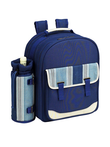 Upscale picnic backpack in cool blue stripe with denim is fully equipped for four. Detachable wine holder, and removable waterproof liner in the Thermal Shield insulated cooler compartment. Includes combination corkscrew, hardwood cutting board with juice groove, cheese knife, wood salt and pepper shakers with non spill tops, acrylic wine glasses, coordinating melamine plates, stainless steel flatware and cotton napkins. Easy to carry with ergonomic Backpack straps or hand grip. Extra front pocket for storage. Designed and Assembled in the USA. Lifetime Warranty.