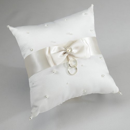 Covered in ivory satin, this elegant ring pillow is decorated with scattered pearls on the front and a pair of large and small pearls at the four corners. A darker ivory satin ribbon wraps around the front of the pillow and is accented by an ivory satin bow and a pearl/rhinestone deco.