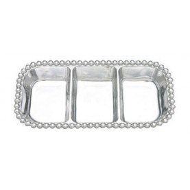This sectional server from Mariposa Brillante is perfect for serving olives, pickles, and other favorite appetizers. The measurements are approximately 12 1/2 inches in length, 6 1/4 inches in width, and 2 inches in height. Created with the signature String of Pearls motif, the sectional server is polished to a gleaming finish. Please wash by hand to preserve the finish.