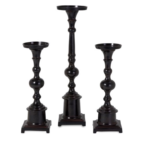 From IMAX's signature collection, the skills required to craft these gorgeous pieces have been passed down from generation to generation. Jack's Candle stands are handcrafted of turned aluminum finished in waxed noir, offering timeless style that will transition into many settings. We include three in our exclusive set, and the pieces measure between 14-20 inches in height and 4.75-5.25 inches in diameter. We recommend pillar candles.