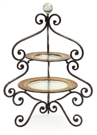 Delight your guests with the two-tier serving tray by IMAX. This exotic serving piece is handcrafted of iron, includes two amber glass serving dishes and is embellished with a marble sphere final. Perfect for an elegant dessert or appetizer display, the tray measures 25.75-inch height by 17-inch diameter. Hand wash only please.