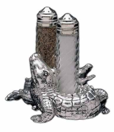 - Arthur Court's 3-piece alligator salt and pepper set includes two swirled glass shakers with screw-on stainless steel tops, and one aluminum stand