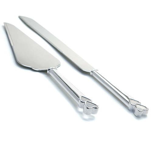 Two open hearts are nestled atop these cake serving utensils. Truly a sentimental design.