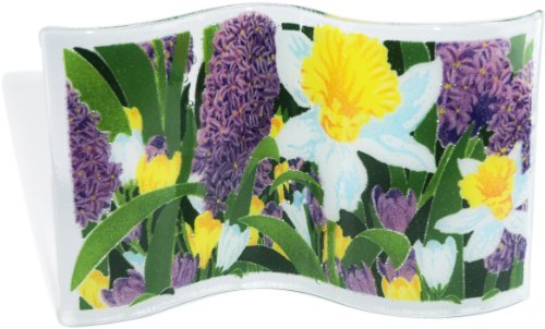 A new and unique, fresh idea for themed decorating, the Peggy Karr Glass Wave sits on the tabletop, desktop, or credenza as a moveable piece of artwork which can be used as a buffet centerpiece, a holiday tableau, or even as a window display. Each hand-crafted fused glass Wave is decorated with the same care and quality as Peggy Karr plates and bowls and measures approximately 8-inches tall X 12 1/2-inches wide X 3" deep. The gentle undulating wave holds the piece upright without the use of a stand. Used as an accent or as the focal point of your glass display, your Peggy Karr Glass Wave will be admired by everyone as a unique and unusual way to display your sense of style and celebrate the energy of Spring - or another fun way to enjoy the vibrant colors and great designs of Peggy Karr Glass! All Peggy Karr Glass is made In America; every item hand-crafted by skilled artisans in their New Jersey studios, signed with the studio signature and dated with the year of production. Spring Garden design.
