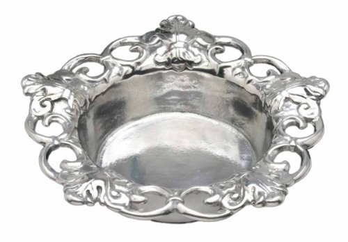 This Arthur Court wine caddy turns casual entertaining into an elegant affair. Crafted with Arthur Court's premium signature aluminum alloy, this wine holder reflects solid craftsmanship, detail, and a unique style. Ideally suited for serving wines at the table, this deep, saucer-like caddy measures 6-1/2-inch across and keeps tabletops and linens protected. This item can also function easily as a nut or candy dish. An elegant textured motif with a fleur de lis pattern with open fretwork surrounds the perimeter giving way to a smooth, shiny surface towards its center. This wine serving caddy holds a standard size bottle of wine and should be hand washed to preserve the metal's shiny surface.