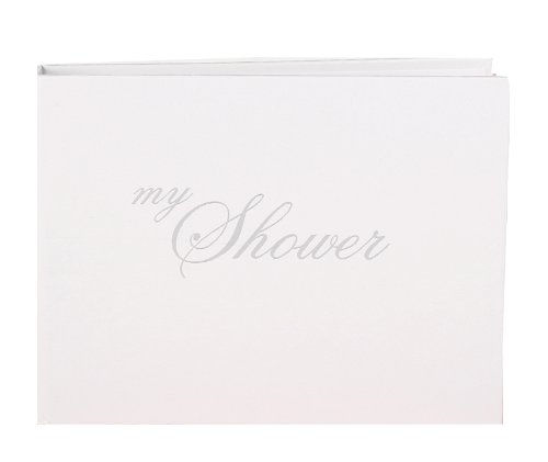Small white shower guest, gift, and photo album accented with silver foil; 24 guest pages record up to 280 signatures. Includes 10 photo pages. Book is 7-1/2 by 5-3/4-inch.