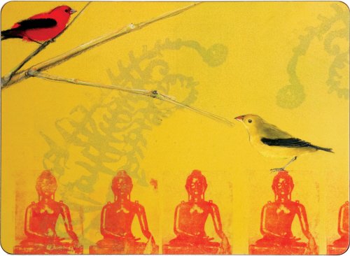 This sturdy, 12" x 16" Warbler on Buddha placemat set by California artist Sylvia Gonzalez adds an elegant touch to any home. Thick and moisture-resistant, this set of 4 hard placemats wipes clean and features a thin cork backing for great furniture protection. They're even heat-resistant to 225 degrees! The glossy green gift box makes them perfect for hostess gifts. Artist's bio on front of package.
