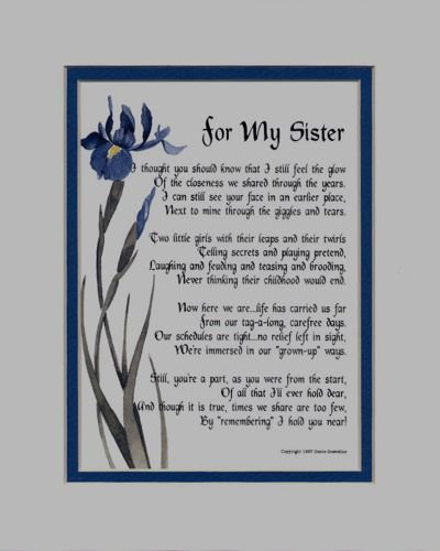 This beautiful, heart-stirring verse was created by nationally recognized poet, Genie Graveline. Her work can be found in fine gift stores throughout the country. This quality product is 8 x 10 in size. It is double matted. Verse is......For My Sister......I thought you should know that I still feel the glow......Of the closeness we shared through the years......I can still see your face in an earlier place,......Next to mine through the giggles and tears......Two little girls with their leaps and their twirls......Telling secrets and playing pretend,......Laughing and feuding and teasing and brooding,......Never thinking their childhood would end......Now here we are...life carried us far......From our tag-alone, carefree days......Our schedules are tight...no relief left in sight,......We're immersed in our grown-up ways......Still, you're a part, as you were from the start,......Of all that I'll ever hold dear,......And Although it is true...times we share are too few,......by remembering I hold you near!......