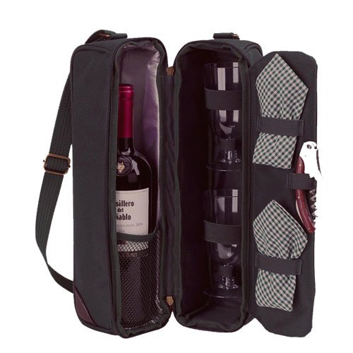 Top quality deluxe wine holder with glasses featuring state of the art Thermal Shield insulation to maintain wine at the perfect temperature. Glass compartment can be used to hold a second bottle. Contains two glasses, napkins and combination corkscrew. Adjustable shoulder strap. This stylish gift will always impress. Rugged 600D canvas construction. Designed and assembled in the USA. Lifetime warranty.