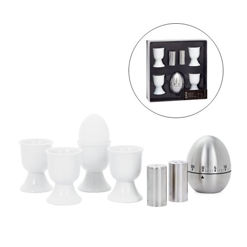 A charming gift for the egg lover, the Axis Egg Cup Seven Piece Breakfast Set has everything you need to prepare and serve the delectable treats in style, and perfectly, every time Boxed set includes four white ceramic egg cups, stainless steel salt and pepper shakers, and a stainless egg timer. Egg cups measure 2d by 2-3/4h-inch, shakers measure 1d by 2h-inch each, and the timer is 2-1/2d by 3h-inch.