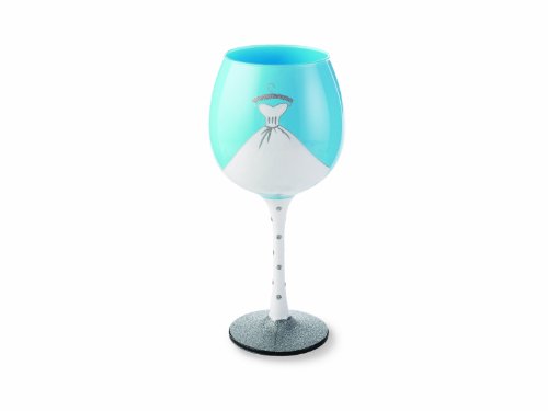 Hand painted 16-ounce wine glass comes in an acetate box for easy gift-giving. With glamorous wedding dress design reads: "Bride" in beautiful silver script on blue background.