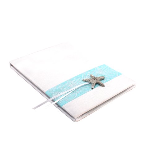 A band of embroidered seashells with starfish detail on a beautiful water blue linen look fabric, framed with a white linen look satin make this Guest book truly stunning. Top it off with a silver starfish and you have a breath taking addition to your wedding. There are approximately 25 pages which accommodate 430 names. The pages are lined with two columns for guest name and special thoughtsMaterialsFaux Thai Silk/100-percent polyester.