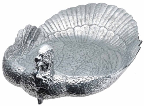 Great for serving game and entertaining a crowd, this Arthur Court LargeTurkey Tray features a generous surface area, with the fabulous design and detailing Arthur Court is known for. The turkey motif is so unique on this piece, and features added dimension, as the sides of this platter curve upward, while its head rises up off the tray. This piece is so elegant and beautiful you may find a permanent home for it as a display piece. This platter measures 24 L X 18 W X 7-1/2 at its highest point, and is manufactured using Arthur Court's signature premium aluminum alloy.