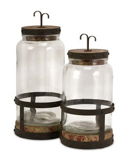 Handcrafted of wood, glass, and iron, the Sloan Lidded Canisters by IMAX are an extraordinary mixture of rustic and modern. Our set includes two, each has a diameter 6-3/4-Inch. The small has a height of 14-Inch, and the large measures 16-1/2 tall. They are sure to be your new kitchen favorite.