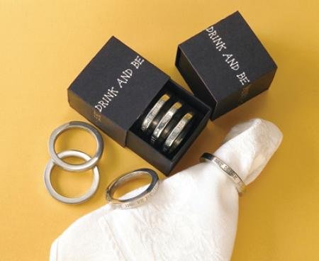 Inspire great cheer and liven up any dinner party with these encouraging words cast in fine white satin pewter. This set of four napkin rings lends a festive mood to any gathering of people and food. Presented in a stylish black box with silver lettering, they make an ideal gift for a special host or hostess. They also make a lovely wedding or bridal shower gift.